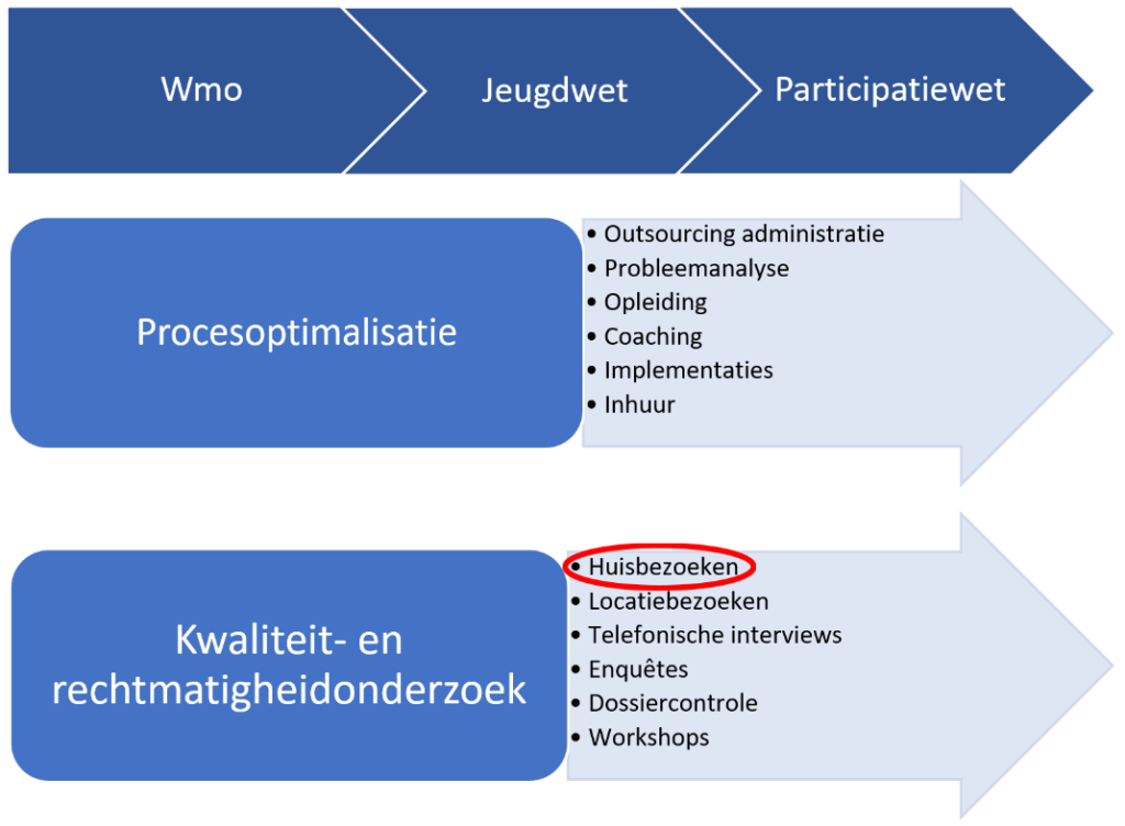 Hieronder ziet u ons aanbod in het Sociaal Domein. Een onderdeel van dit aanbod is het uitvoeren van kwaliteit- en rechtmatigheidsonderzoeken. Wij voeren dit vanaf 2012 uit voor veel gemeenten in Nederland. Door onze uitgebreide onderzoekservaring kunnen we goed inschatten welke onderzoeksmethode aansluit bij de vraag van de desbetreffende gemeente(n). Een van deze methodes is het uitvoeren van onderzoek middels huisbezoeken. In dit artikel gaan we dieper in op deze dienst.